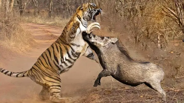 فیلم  شکار شگفت انگیز گراز غول پیکر توسط ببر جوان! / حتما ببینید
