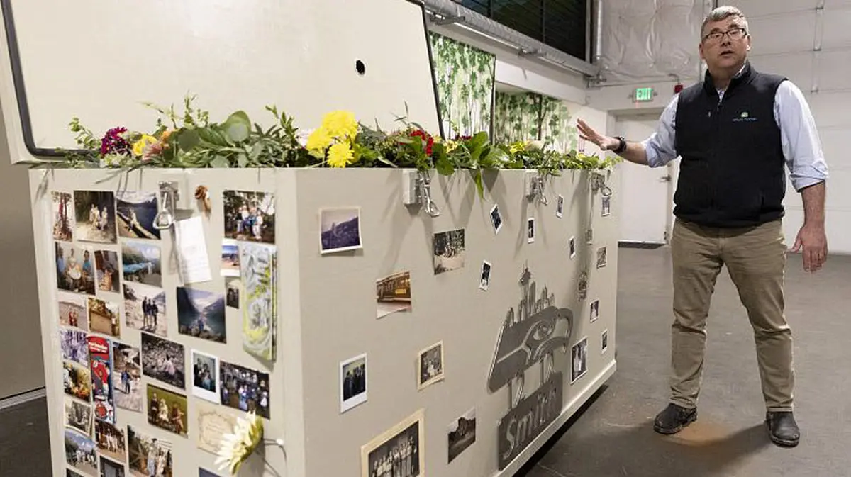 یک محفظه قابل استفاده مجدد اجساد که توسط خانواده متوفی تزئین شده است