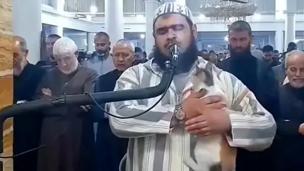 امام جماعت درحال تلاوت آیاتی از قرآن کریم بود که گربه از روی او بالا رفت و امام جماعت با دست هایش کمک کرد تا گربه روی شانه اش قرار بگیرد. گربه لحظاتی بعد به پایین پرید.