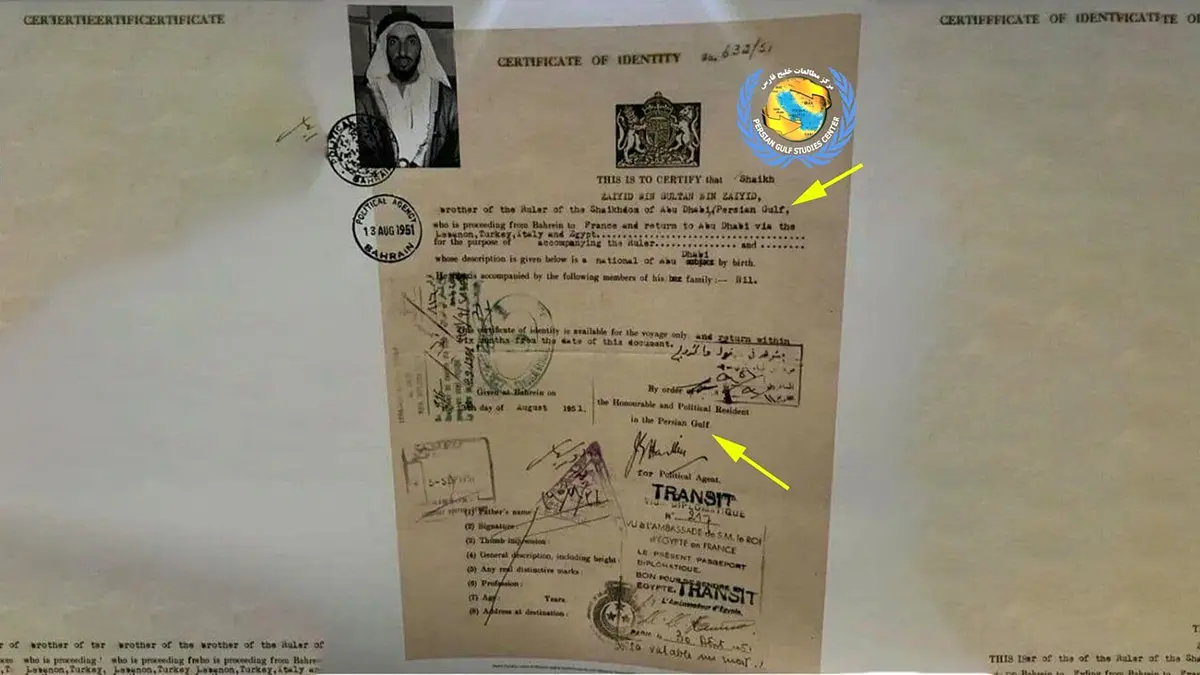 این تصویر گذرنامه شیخ زاید آل نعمان موسس امارات متحده عربی در سال ۱۹۵۱ است که در آن نام نامی خلیج فارس با عنوان واقعیش درج شده و این سندیست محکم بر اثبات کذبیت ادعاهای واهی کشورهای عربی در نسبت دادن عناوین جعلی بر خلیج همیشگی فارس.