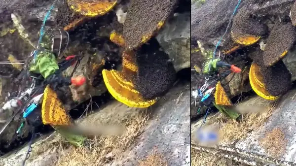 رکنا: در این ویدئو می بینید که چگونه شکارچی ماهر عسل وحشی با شمشیر کندوهای عسل را برش می زند.
