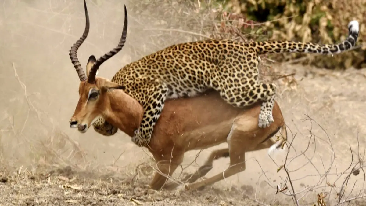 یک پلنگ که با کمین زدن برای ایمپالابه آهستگی خود را به آنها رساند، با یورشی حیرتانگیز یکی از آنها را شکار کرد.پلنگ هوشمندانه از بوتهها استفاده کرد تا خود را پنهان کند و به فاصله چند متری ایمپالا نزدیک شد و در آنجا با حمله به یک ایمپالا این حیوان را گرفت.
