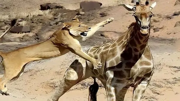 فیلم/ له شدن شیر، زیر دست و پای زرافه