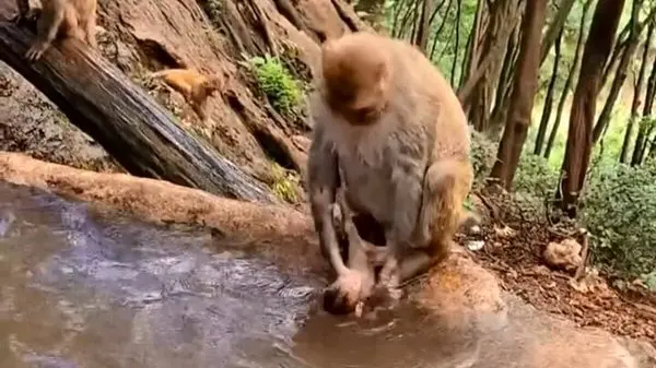فیلم/ تصویری که ندیدید؛ میمون مادر در جنگل بچهاش را میشوید؛ درست شبیه انسان
