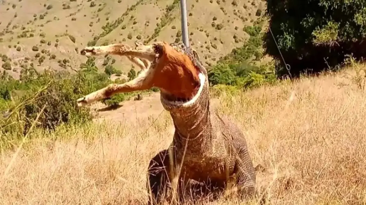 در این ویدیو لحظاتی رو می بینید که اژدهای کومودو داره تلاش می کنه تا شکار و طعمه های بزرگی که نصیبش شده را تو دهنش جا بدهد