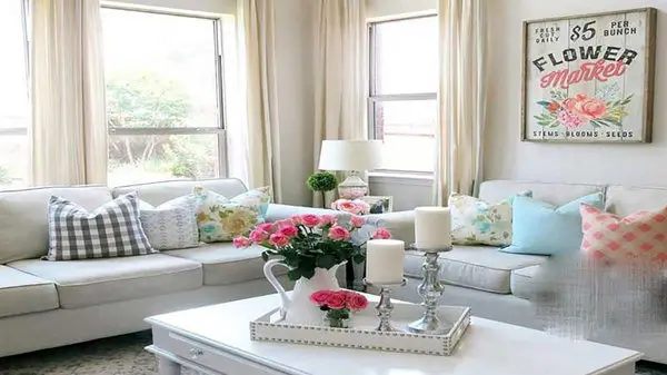 از رنگ‌های بهاری مانند صورتی، سرخابی، بنفش، سبز، آبی روشن و رنگ‌های پاستلی در دکوراسیون خانه استفاده کنید؛ شما می‌توانید از کوسن، پرده یا دیگر لوازم جانبی با این رنگها استفاده کنید. باور کنید که حتی اضافه کردن یک گلدان، رانر رنگی، شمع‌های پاستلی یا ظرف پذیرایی رنگارنگ تغییر بسیار زیبایی در فضای سالن ایجاد می‌کند.