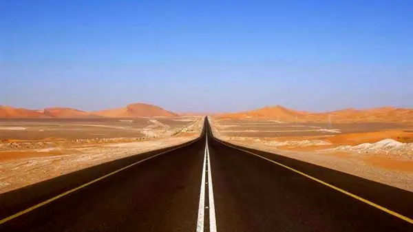 این جاده آسفالت ۲۶۵ کیلومتری، بدون هیچ پیچی به چپ یا راست یا شیب قابلتوجه به بالا یا پایین، از دل صحرای وسیع ربع الخالی که بزرگترین بیابان شنی جهان است، میگذرد. مدت زمان رانندگی برای طی این مسیر تمام مستقیم حدود دو ساعت است.