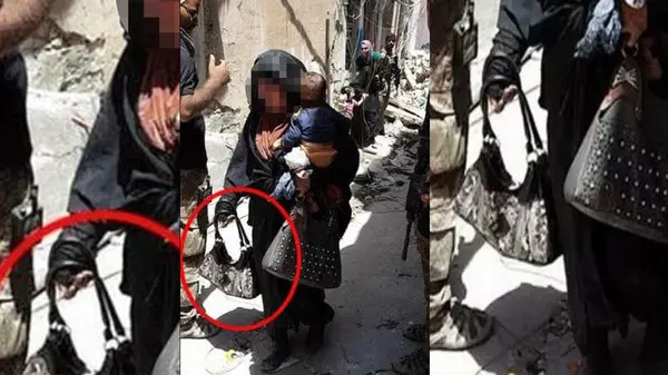 زن در حالیکه یک کودک را در آغوش گرفته دو کیف دستی به همراه دارد که یکی از آنها حاوی بمب است.