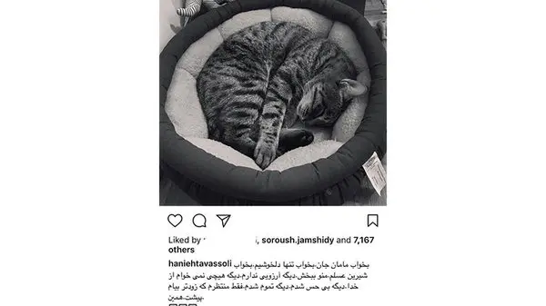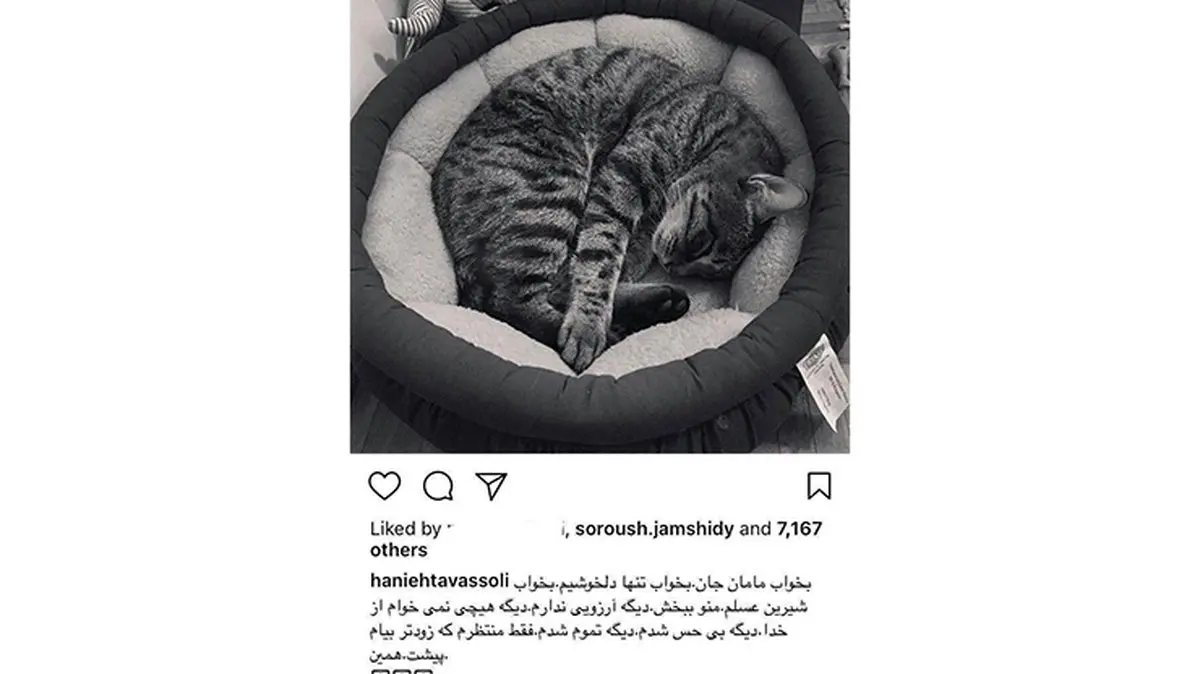 هانیه توسلی بازیگر کشور در مطلبی که در صفحه شخصی خود گذاشت از مرگ گربه خود خبر داد و نوشت: بخواب تنها دلخوشیم! دیگه هیچی از خدا نمیخوام! دیگه تموم شدم، فقط منتظرم بیام پیشت.