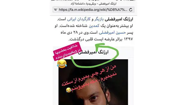 حوادث رکنا: ارژنگ امیرفضلی با انتشار پستی اینستاگرامی و در واکنش به خبر مرگش در ویکیپدیا، به شوخی نوشت که اهل سکته کردن نیست.