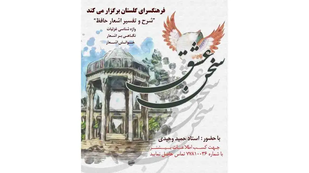 به گزارش رکنا به نقل از روابط عمومی فرهنگسرای گلستان ، سلسله جلسات شرح و تفسیر اشعار حافظ و آموزش حافظخوانی با عنوان «سخن عشق» به همت مدیریت فرهنگی هنری منطقه 8، ویژه عموم مخاطبان برگزار میشود.