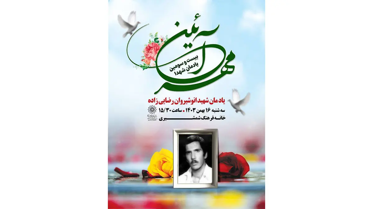 رکنا: خانه فرهنگ شمشیری ویژه برنامه "مهرآیین" را با هدف زنده نگه داشتن یاد و خاطره شهدا روز دوشنبه 16بهمن ماه ساعت 15با تکریم از خانواده شهید انوشیروان رضایی زاده برگزار می کند.