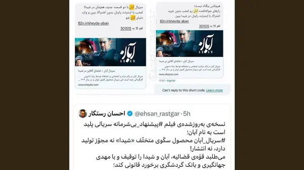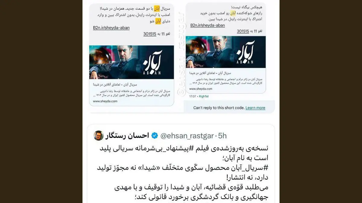 این عضو مجمع تحلیلگران ساترا با اشاره به پیامک رایتل برای سریال بدون مجوز آبان خاطرنشان ساخت: هیچکس بیگناه نیست، این عنوان پیامک انبوه تبلیغاتی سریال بیمجوّز «آبان» است. حجت الاسلام یاسر خلیلی، مدیر کل امور حقوقی و مجلس ستاد امر به معروف و نهی از منکر که اخیراً از «ساترا»ی صدا و سیما شکایت کرده رواست این بار از سکّوی شیدا شکایت کند.