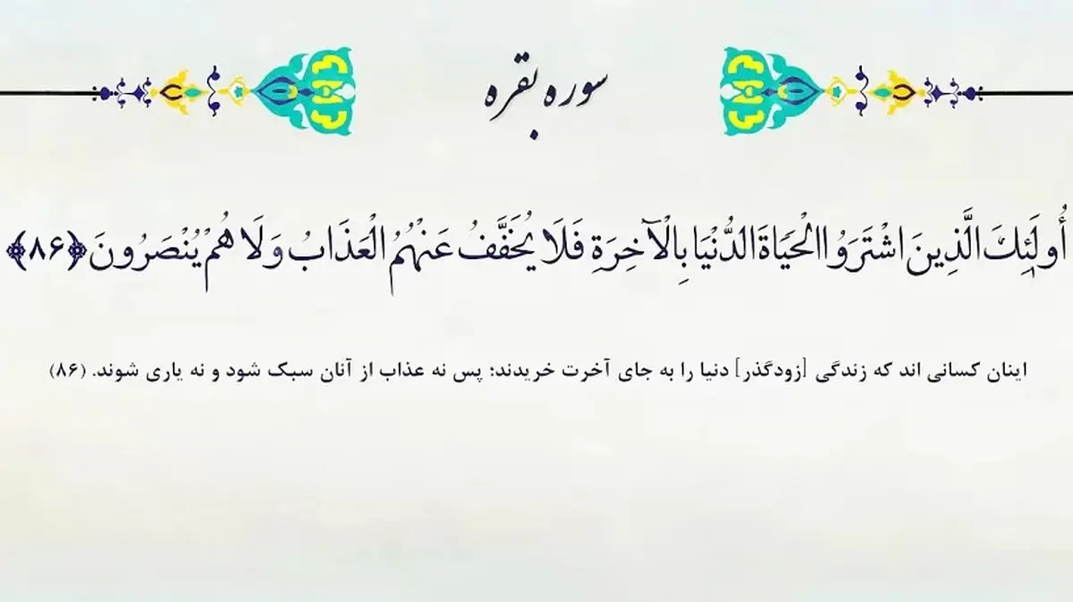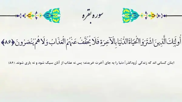 أُولَٰئِکَ الَّذِینَ اشْتَرَوُا الْحَیَاةَ الدُّنْیَا بِالْآخِرَةِ ۖ فَلَا یُخَفَّفُ عَنْهُمُ الْعَذَابُ وَلَا هُمْ یُنْصَرُونَ /// ترجمه: اینان کسانی اند که زندگی [زودگذر] دنیا را به جای آخرت خریدند؛ پس نه عذاب از آنان سبک شود و نه یاری شوند. آیه ۸۶ سوره بقره /// اشاره: خداوند در قرآن کریم بارها زندگی دنیا را نکوهش کرده و به انسان ها متذکر شده که مبادا زندگی دنیا شما را مغرور کند. (لقمان - ۳۳) دلیل این نکوهش این است که قرآن به انسان ها زندگی و حیاتی وعده کرده که زندگی دنیا در مقابل آن بسیار بی ارزش است و نباید آن را به زندگی دنیا فروخت. خدا در آیه ۳۸ سوره توبه درباره نسبت دنیا و آخرت می فرماید: «آیا به جای آخرت به زندگی دنیا خشنود شده اید؟ پس بدانید که فواید و منافع دنیا در برابر آخرت جز اندکی نیست.» در حدیثی از حضرت رسول اکرم (ص) می خوانیم: «نسبت دنیا به آخرت مثل این است که یکی از شما انگشت خود را به دریا زند و سپس بیرون آورد. پس ببیند چه مقدار از آب دریا را با آن برداشته است؟!» در حدیثی از امام علی آمده است: «آیا آزاده ای نیست که این ته مانده دنیا را برای آنان که در خور آنند، بیفکند؟! هــر آینه جان های شما را بهایی جز بهشت نیست؛ پس خود را جز به آن مفروشید. آری، آنجا که انسان بر سر دوراهی دنیا و آخرت قرار می گیرد اگر دنیا را برگزیند مورد ملامت قرآن است و الا بهره گیری حلال از نعمات و لذات دنیا مورد نکوهش قرآن نیست؛ چنان که در آیه ۳۲ سوره اعراف می فرماید: «بگو: چه کسی زینت های خدا را که برای بندگانش پدید آورده و روزی های پاکیزه را حرام نموده؟ بگو آنها در زندگی دنیا از آن کسانی است که ایمان آورده اند (هر چند کفار هم با آنها شرکت جویند) در حالی که در روز قیامت مخصوص آنها خواهد بود. این چنین ما آیات خود را برای گروهی که می دانند تفصیل می دهیم.» منبع: قرآن حکیم . ترجمه آیت الله مشکینی .صفحه۱۳