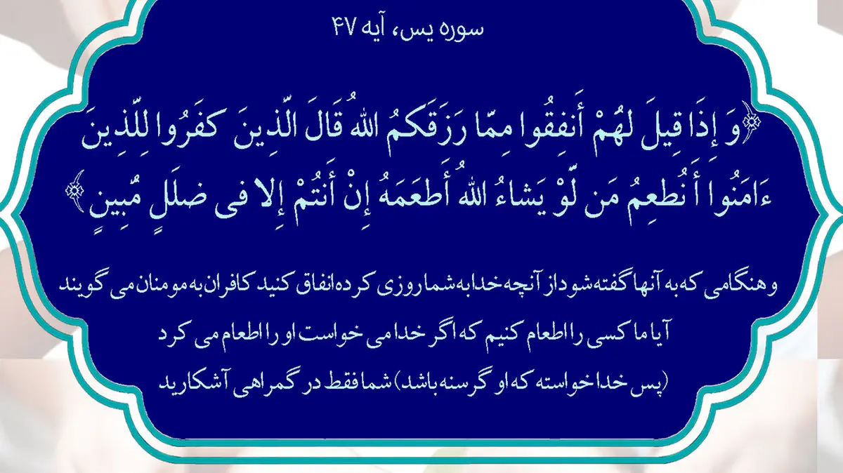 وَإِذَا قِیلَ لَهُمْ أَنْفِقُوا مِمَّا رَزَقَکُمُ اللَّهُ قَالَ الَّذِینَ کَفَرُوا لِلَّذِینَ آمَنُوا أَنُطْعِمُ مَنْ لَوْ یَشَاءُ اللَّهُ أَطْعَمَهُ إِنْ أَنْتُمْ إِلَّا فِی ضَلَالٍ مُبِینٍ ( آیه 47 سوره یس) /// ترجمه: و هنگامی که به آنان گویند: از آنچه خدا روزی شما کرده، انفاق کنید، کافران به مؤمنان گویند: آیا کسانی را اطعام کنیم که اگر خدا می خواست آنان را اطعام می کرد؟ [پس گرسنگی را خدا بر آنان خواسته است] ولی شما [ای کفرپیشگان!] جز در گمراهی آشکاری نیستند. /// اشاره : سخنی که این آیه از قول کافران نقل میکند همان گفته بسیار عوامانه ای است که در هر عصر و زمان از ناحیۀ افراد خودخواه و بخیل مطرح میشود؛ این که اگر فلانی فقیر است، لابد کاری کرده که خدا میخواهد فقیر بماند و اگر ما ثروتمند هستیم لابد عملی انجام داده ایم که مشمول لطف خدا شده ایم بنابر این نه فقر آنها و نه غنای ما هیچ کدام بی حکمت نیست گوینده این سخن، غافل از این است که این جهان میدان آزمایش است و خداوند یکی را با تنگدستی امتحان میکند و دیگری را با غنا و ثروت و گاه یک انسان را در دو زمان با این دو در بوته امتحان قرار میدهد که آیا به هنگام ،فقر به امانت و مناعت طبع و شکرگزاری پابند میماند یا همه را زیر پا میگذارد و همچنین به هنگام غنا از آنچه در اختیار دارد در راه خدا کند یا نه در حقیقت نظام تکوین چنین ایجاب میکند که خداوند زمین را با تمام مواهبش در اختیار بشر قرار دهد و آنها را در اعمال خود برای طی کردن مسیر تکامل آزاد بگذارد و در عین حال غرایزی در او آفریده که هر کدام او را به سویی سوق میدهد نظام تشریع نیز چنین ایجاب کرده که قوانینی برای کنترل غرایز تهذیب نفوس و تربیت انسانها از طریق ایثار و فداکاری و گذشت و انفاق قرار دهد و انسان را که استعداد رسیدن به مقام خلیفة اللهی دارد از این طریق به آن مقام منبع برساند با زکات تطهیر نفوس کند و با انفاق بخل را از دلها بزداید و فاصله طبقاتی را که منشأ هزاران فساد در زندگی بشر است از بین ببرد. این درست به آن میماند که افرادی بگویند چه ضرورتی دارد که ما درس بخوانیم یا دیگری را درس بدهیم. اگر خدا میخواست به همۀ ما علم میداد تا هیچ کس نیاز به فرا گرفتن علم نداشته باشد آیا هیچ عاقلی این منطق را انفاق می پذیرد؟ // تفسیرنمونه .جلد۳.صفحه 410 / قران حکیم ، ترجمه آیت الله مشکینی