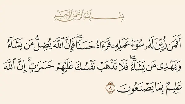 أَفَمَنْ زُیِّنَ لَهُ سُوءُ عَمَلِهِ فَرَآهُ حَسَنًا ۖ فَإِنَّ اللَّهَ یُضِلُّ مَنْ یَشَاءُ وَیَهْدِی مَنْ یَشَاءُ ۖ فَلَا تَذْهَبْ نَفْسُکَ عَلَیْهِمْ حَسَرَاتٍ ۚ إِنَّ اللَّهَ عَلِیمٌ بِمَا یَصْنَعُونَ / آیه ۸ فاطر /// ترجمه: پس آیا کسی که کردار زشتش برای او زینت داده شده و [به این سبب] آن را خوب دیده [مانند کسی است که در پرتو ایمان، خوب و بد را تشخیص داده است؟] همانا خدا هر که را بخواهد [به کیفر تکبّرش در برابر حق] گمراه می کند و هر که را بخواهد هدایت می نماید. پس مبادا جانت به سبب حسرت هایی که بر آنان می خوری از بین برود؛ بی تردید خدا به آنچه انجام می دهند داناست. /// اشاره : این آیه نشانه مهم همه بدبختی های اقوام گمراه و لجوج را نشان می دهد؛ این که اعمال زشتشان به خاطر هماهنگ بودن با شهوات و قلب های سیاهشان در نظرشان زیباست. بدیهی است که چنین کسی نه موعظه ای می پذیرد و نه آمادگی برای شنیدن انتقاد دارد و نه هرگز حاضر است مسیر خود را تغییر دهد نه اعمال خویش را تجزیه و تحلیل می کند و نه از عواقب آن بیمناک است. چه کسی اما اعمال زشت بدکاران را در نظرشان خوب جلوه می دهد؛ خداوند یا هوای نفس یا شیطان؟ بدون شک، عامل اصلی، هوای نفس و شیطان است؛ اما چون خدا این اثر و پیامد را برای اعمال بد قرار داده، می توان آن را به خدا نسبت داد. انسان ها هنگامی که گناهی را مرتکب می شوند، در آغاز که فطرتشان پاک و وجدانشان بیدار و عقلشان واقع بین است، از عمل خود ناراحت می شوند؛ اما اگر آن را تکرار کنند، از ناراحتی آنها کاسته می شود و به تدریج به مرحله بی تفاوتی می رسند و اگر باز هم تکرار کنند، زشتی ها در نظرشان زیبا می شود؛ تا آنجا که آن را از افتخارات و فضایل خویش می پندارند؛ در حالی که در منجلاب بدبختی غوطه ور شده اند. در روایتی از پیامبر اسلام (ص) نقل شده که "روزی شیطان با حضرت موسی (ع) ملاقاتی داشت. ضمن سخنانی که بین آنها رد و بدل شد، حضرت موسی (ع) از او پرسید: مرا از گناهی باخبر کن که اگر آدمی آن را انجام دهد، بر او مسلط می شوی. او گفت: هنگامی که شخصی خودش از خودش خوشش بیاید و کارهای خوبش را بسیار شمارد و گناهانش در چشمش کوچک شود (بر او مسلط می شوم)." /// منبع : قرآن حکیم ،ترجمه آیت الله مشکینی،صفحه 435