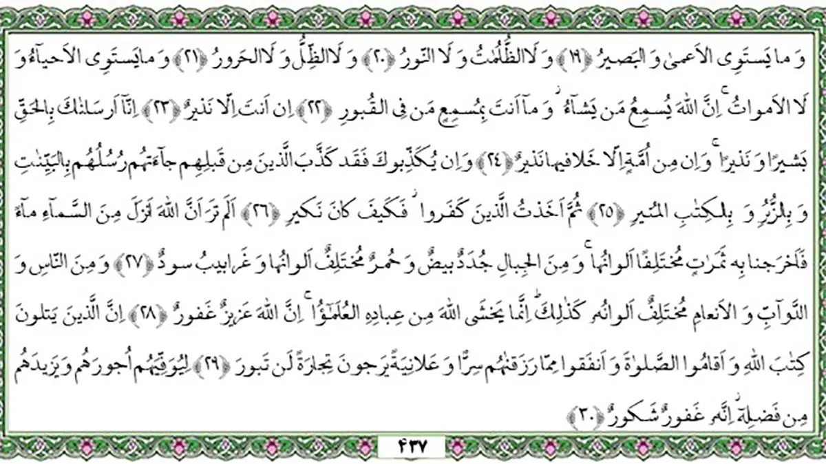 19وَ ما یَسْتَوِی الْأَعْمى وَ الْبَصِیرُ / 20وَ لاَ الظُّلُماتُ وَ لاَ النُّورُ / 21وَ لاَ الظِّلُّ وَ لاَ الْحَرُورُ / 22وَ ما یَسْتَوِی الْأَحْیاءُ وَ لاَ الأَمْواتُ إِنَّ اللّهَ یُسْمِعُ مَنْ یَشاءُ وَ ما أَنْتَ بِمُسْمِع مَنْ فِی الْقُبُورِ / 23إِنْ أَنْتَ إِلاّ نَذِیرٌ ( آیات 19 تا 23 سوره فاطر) /// ترجمه: 19 ـ و نابینا و بینا هرگز برابر نیستند. / 20 ـ و نه ظلمتها و روشنائى. / 21 ـ و نه سایه (آرام بخش) و باد داغ و سوزان! / 22 ـ و هرگز مردگان و زندگان یکسان نیستند. خداوند پیام خود را به گوش هر کس بخواهد مى رساند، و تو نمى توانى سخن خود را به گوش آنان که در گور خفته اند برسانى! / 23 ـ تو فقط انذار کننده اى (و اگر ایمان نیاورند نگران نباش). اشاره : قرآن برای مرزهای جغرافیایی و نژادی و طبقاتی و مانند آن که انسان ها را از یکدیگر جدا می کند، اهمیتی قائل نیست. از نظر قرآن، تنها مرز، مرز ایمان و کفر است و به این ترتیب، تمام جامعه انسانی را به دو گروه مؤمن و کافر تقسیم می کند. قرآن بارها ایمان را به نور، و کفر را به تاریکی تشبیه کرده است. این تشبیه، زنده ترین معرف قرآنی برای کفر و ایمان است. ایمان، نوعی درک و دید باطنی، نوعی علم و آگاهی توام با عقیده قلبی و جنبش و حرکت و نوعی باور است که در اعماق جان انسان نفوذ می کند و سرچشمه فعالیت های سازنده می شود؛ اما کفر، جهل است و ناآگاهی و ناباوری که نتیجه آن عدم تحرک و فقدان احساس مسئولیت و حرکت های شیطانی و منحرف است. این را نیز می دانیم که نور در جهان ماده، مبدأ هرگونه حیات و حرکت و رشد و نمو در انسان و حیوان و گیاه است؛ به عکس، ظلمت و تاریکی، عامل خاموشی و خواب و - در صورت ادامه - موجب مرگ و نابودی حیات است. بنابر این جای تعجب نیست که در این آیات، ایمان و کفر در یک جا به نور و ظلمت و در جای دیگر به حیات و مرگ و در دیگر جا به سایه آرام بخش و باد سوزان و در جای دیگر به بینایی و نابینایی تشبیه گردیده و همه گفتنی ها در ضمن این چهار تشبیه بیان شده است. هنگامی که با یک فرد مؤمن نشست و برخاست می کنیم، اثر این نور را در تمام وجودش احساس می کنیم: افکارش، روشنی بخش و سخنانش درخشنده است و اعمال و اخلاق ما را با حقیقت زندگی و حیات واقعی آشنا می کند؛ اما کافر از تمام وجودش ظلمت می بارد. جز به منافع مادی و زودگذر خویش نمی اندیشد و افق فکرش از محدوده زندگی شخصی اش فراتر نمی رود. در شهوات غوطه ور است و هم نشینی او، قلب و روح انسان را در امواج ظلمت فرو می برد. منبع:تفسیر نمونه،جلد18، صفحه 231 . قران حکیم ،ترجمه آیت الله مشکینی،صفحه437