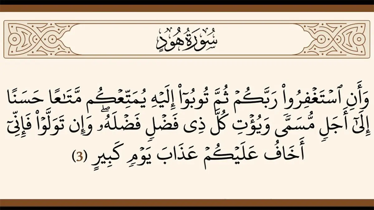 وَأَنِ اسْتَغْفِرُوا رَبَّکُمْ ثُمَّ تُوبُوا إِلَیْهِ یُمَتِّعْکُمْ مَتَاعًا حَسَنًا إِلَىٰ أَجَلٍ مُسَمًّى وَیُؤْتِ کُلَّ ذِی فَضْلٍ فَضْلَهُ ۖ وَإِنْ تَوَلَّوْا فَإِنِّی أَخَافُ عَلَیْکُمْ عَذَابَ یَوْمٍ کَبِیرٍ (آیه۳سوره هود) /// ترجمه: و اینکه از پروردگارتان آمرزش بخواهید، سپس به سوی او بازگردید تا آنکه شما را تا پایان زندگی از بهره نیک و خوشی برخوردار کند، و هر که را صفات پسندیده و اعمال شایسته او افزون تر است، پاداش زیادتری عطا کند، و اگر روی از حق برگردانید، من از عذاب روزی بزرگ بر شما بیمناکم. /// اشاره: قرآن در این آیه و آیات فراوان دیگر اعلام کرده است که دین داری و مذهب، پیش از آن که زندگی پس از مرگ را آباد کند، آباد کننده زندگی دنیوی است. بعضی، پیوند مواهب مادی دنیا با ایمان و توبه و استغفار را یک پیوند معنوی و ناشناخته میدانند؛ در حالی که دلیلی ندارد که برای این پیوند و رابطه، تفسیر ناشناخته ای کنیم. هر انسان عاقل و منطقی قبول دارد که دروغ و تقلب و دزدی و ظلم و ستم و تبعیض، شیرازه زندگی اجتماعی را از هم میپاشد و زندگی انسانها را تیره و تار میکند. قرآن کریم در این آیه و آیه پیش، قبول و رعایت این چهار اصل را سبب آبادانی زندگی دنیای انسان ها و مسلمانان می داند: 1- توحید الا تعبدوا الا الله -2- پذیرش رهبری پیامبران انتی لکم منه نذیر و بشیر». 3 - پاک سازی محیط از گناه استغفروا ربکم» 4 - بازگشت به ارزش های الهی و آراستگی به آن: «توبوا الیه». به همین دلیل، پس از ذکر این چهار اصل میخوانیم: یمتعکم متاعاً حسناً الى اجل مسمى» (تا شما را با بهره خوشی از زندگی) تا مدتی معین برخوردار نماید) «و یؤت کل ذى فضل فضله» (و به هر صاحب فضلی فضل او را پاداش دنیوی و اخروی کمالات هر صاحب کمالی را به تناسب کمالش عطا نماید). منظور از این دو عبارت این است که در صورت عمل به دستورهایی که پیش از این گفته شد، خداوند به کسی که در ویژگیه او صفات پسندیده و تلاش و کوشش بر دیگران فضیلت دارد، به همان مقدار فضیلتش اجر و مزد و سعادت و خوشبختی و توفیق عنایت می کند و بدین ترتیب، هر کسی که در خصوصیتی فضیلت و امتیاز دارد به خوبی میتواند از آن استفاده کند و به رتبه و درجه مناسب خود در دنیا و آخرت نایل شود. این حقیقتی است که تنها در سایه توحید و ایمان به خدا وجود دارد؛ چون خداوند عادل است و حق هیچ کسی را ضایع نمی کند. در جوامع بشری اما که از توحید و ایمان به خدا عاری هستند - هر چند در ظاهر پیشرفته و مترقی باشند - این مطلب به چشم نمی خورد؛ چون همواره در جامعه هایی که انسان ها بدون توجه به خدا زندگی می کنند، مردم به دو گروه مستکبر و مستضعف تقسیم میشوند و تمام امتیازات به گروه مستکبر و زیاده خواه داده می شود - هر چند لایق آن نباشد - و گروه مستضعف اگرچه دارای فضیلت و لایق خوشبختی باشد، همواره در بدبختی و ناملایمات دست و پا میزنند. ///منبع المیزان جلد۱۰ صفحه ۱۲۶. قران حکیم .ترجمه آیت الله مشکینی .صفحه۲۲۱