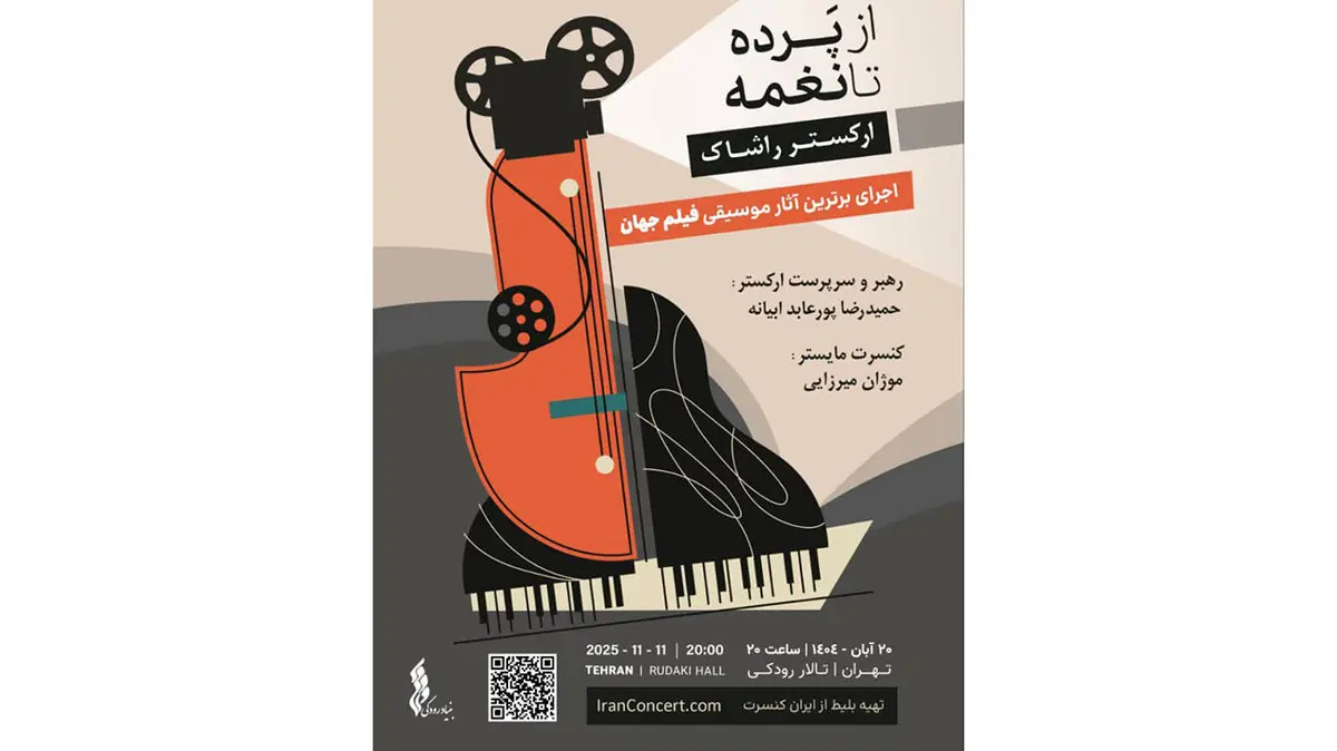 رکنا: ارکستر موسیقی فیلم راشاک به رهبری حمیدرضا پورعابد ابیانه با اجرای آثاری از برترین آهنگسازان موسیقی فیلم جهان، در شامگاه ۲۰ آبانماه در تالار رودکی به روی صحنه میرود.
