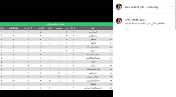امیرمهدی ژوله، بازیگر و نویسنده سینما، تئاتر و تلویزیون که پرسپولیسی دو آتیشه است، با انتشار تصویری از جدول لیگ برتر پس از بازی امروز پرسپولیس و استقلال در اینستاگرام، نوشت: «ماشین سازی چرا انقدر بد نتیجه گرفته.»