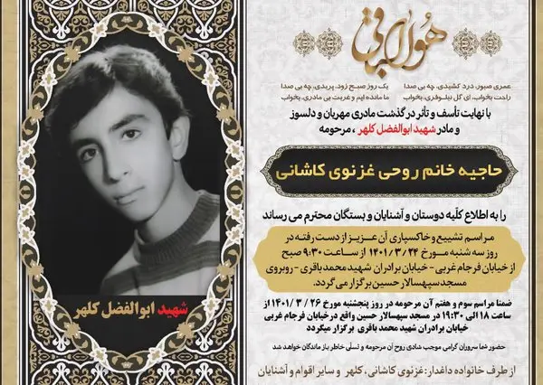 رکنا : مادر شهید ابوالفضل کلهر بعد از تحمل یک دوره بیماری درسن ۷۵ سالگی به دیار باقی و دیدار فرزند شهیدش شتافت.