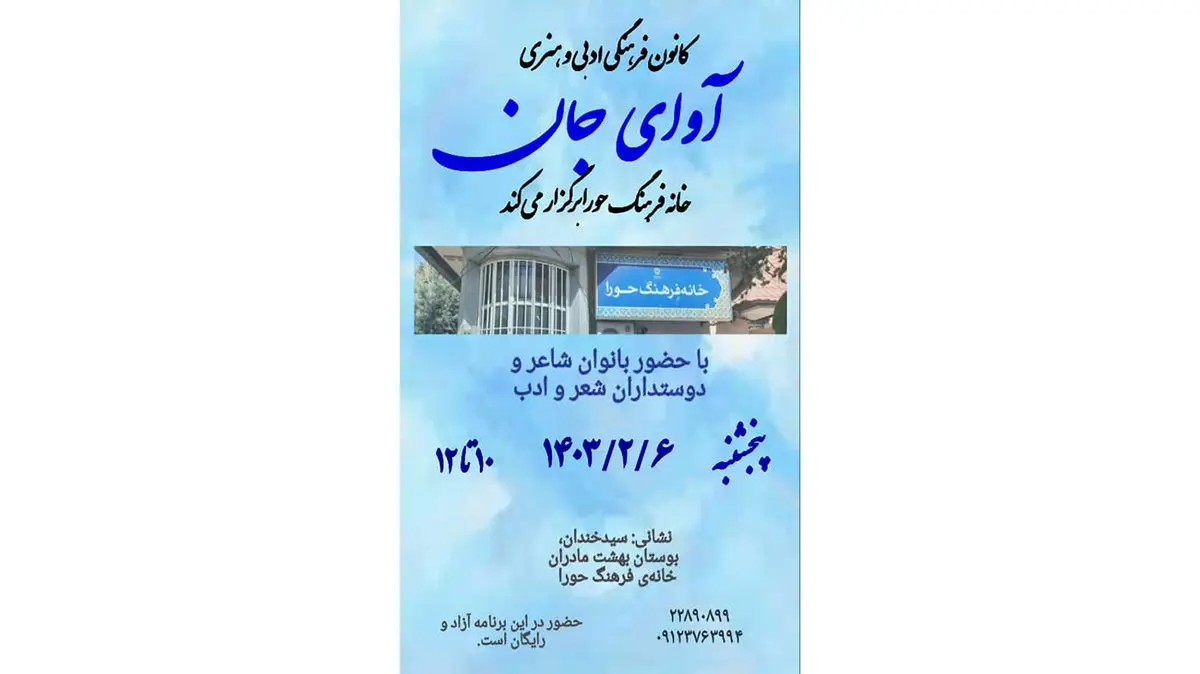 به گزارش رکنا، کانون فرهنگی ادبی و هنری آوای جان فعالیت ادبی خود را با دعوتی پرافتخار از بانوان شاعر ، ادیب و هنرمند در خانهی فرهنگ حورا میآغازد.