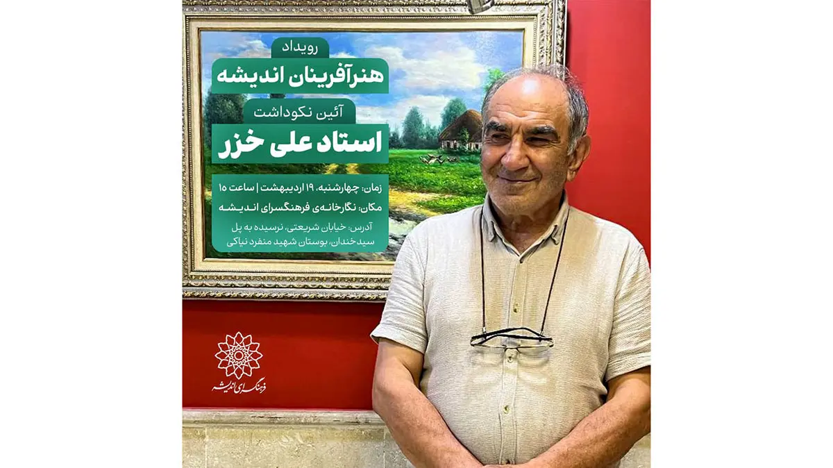 مراسم نکوداشت استاد «علی خزر» روز چهارشنبه ۱۹ اردیبهشت از ساعت ۱۵ در نگارخانه اندیشه بهنشانی خیابان دکتر علی شریعتی، نرسیده به پل سیدخندان، بوستان شهید منفرد نیاکی، فرهنگسرای اندیشه برگزار میشود و حضور عموم علاقهمندان در این مراسم آزاد است.