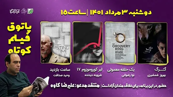 به گزارش رکنا، فیلمهای کوتاه «یک حلقه معمولی»، «ساعت بازدید»، « گرگ » و «لِبِر کروموزوم ۱۷» در یازدهمین جلسه از فصل هفتم پاتوق فیلم کوتاه، اکران، تحلیل و نقد میشوند.