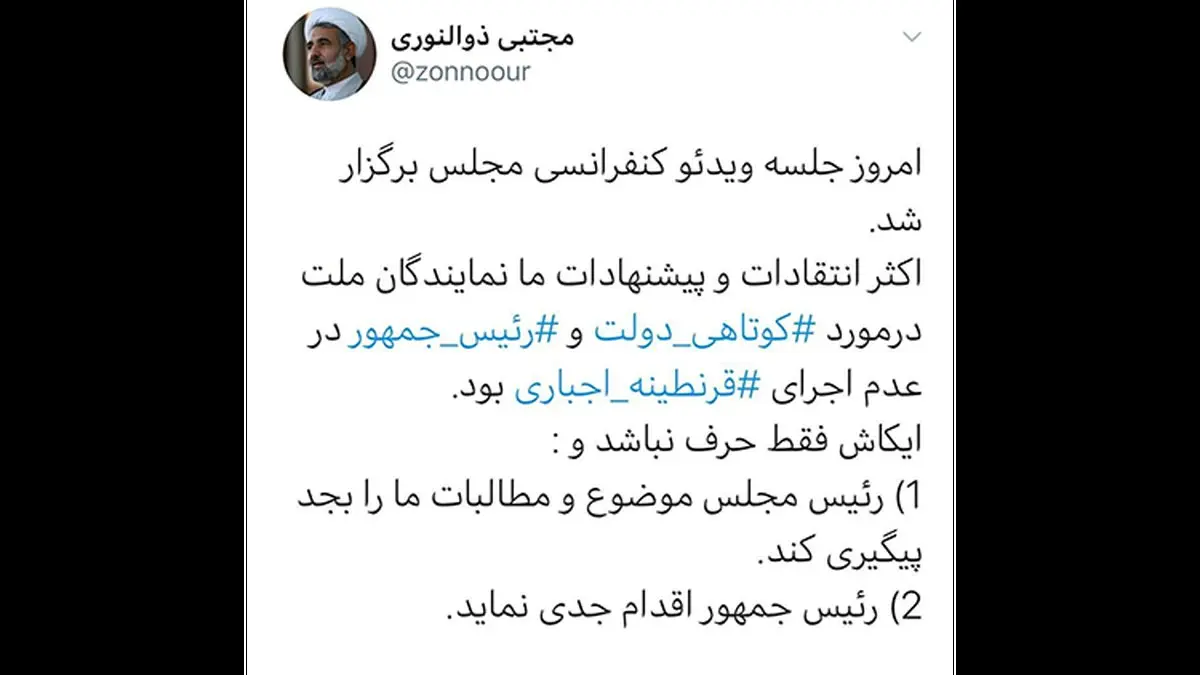 اکثر انتقادات و پیشنهادات ما نمایندگان ملت در مورد کوتاهی دولت و رئیس جمهور در عدم اجرای قرنطینه اجباری بود. ایکاش فقط حرف نباشد و : ۱) رئیس مجلس موضوع و مطالبات ما را بجد پیگیری کند. ۲) رئیس جمهور اقدام جدی نماید. برای ورود به کانال تلگرام ما کلیک کنید.