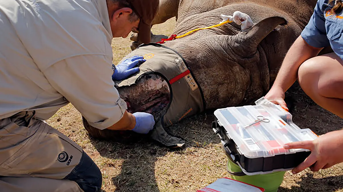 اکنون یکی از رینوهای زخمی باید بیهوش شود تا عملیات نجات و جراحی محل بریده شده شاخ اش درمان شود. کارکنان پارک پس از ساعتها تلاش این حیوان غول پیکر را بیهوش کرده و جراحی می کنند تا تحت نظر دامپزشکان وضعیت جسمانی اش بهبود بخشد.برای ورود به کانال تلگرام ما کلیک کنید.
