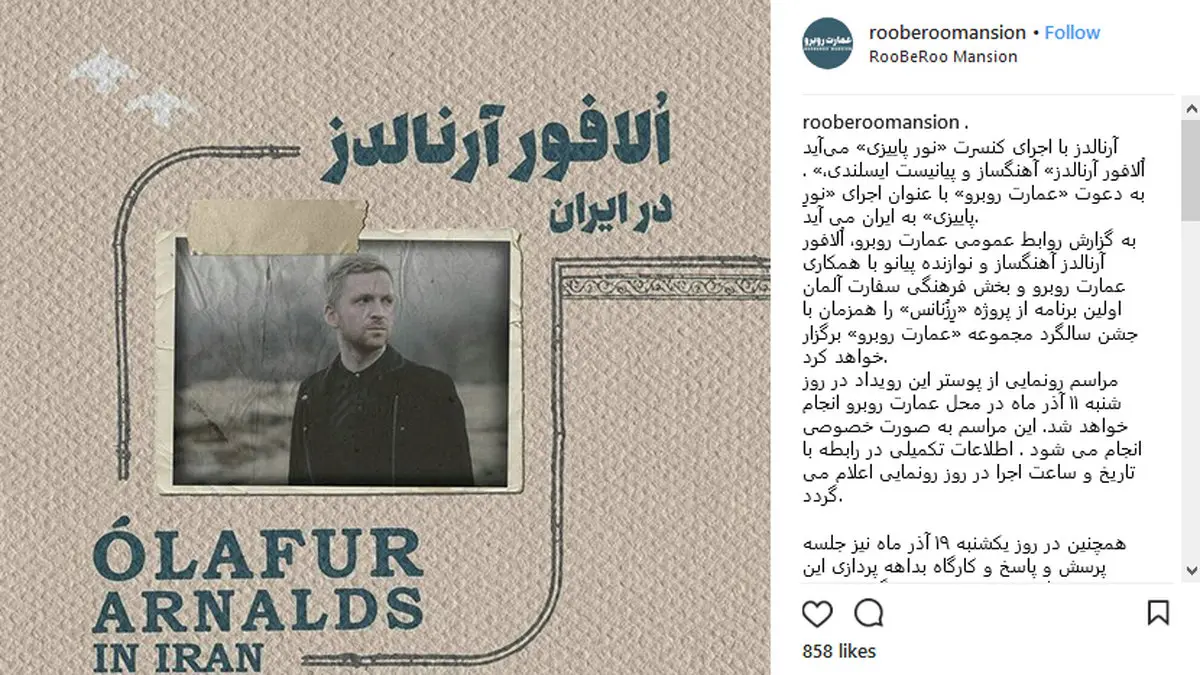 رکنا: اُلافور آرنالدز آهنگساز و پیانیست ایسلندی، به دعوت عمارت روبرو با عنوان اجرای نورِ پاییزی به ایران می آید.