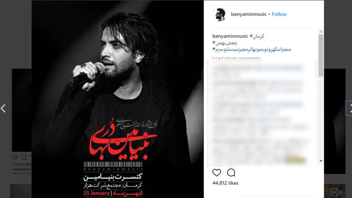 در حالی که قرار بود امروز پنجشنبه پنجم بهمن، کرمانیها شاهد روی صحنه رفتن بنیامین بهادری، خواننده پاپ و ارکسترش در مجتمع شرکت هزارِ این شهر باشند، این کنسرت به درخواست این خواننده پاپ و در اعتراض به جلوگیری از روی صحنه رفتن نوازندگان زن لغو شد.