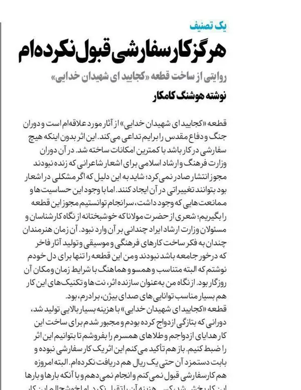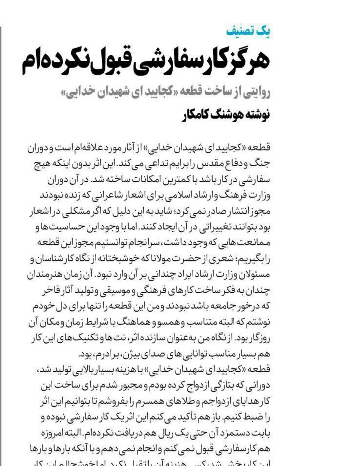 به گزارش رکنا، هوشنگ کامکار: قطعه «کجایید ای شهیدان خدایی» از آثار مورد علاقهام است و دوران جنگ و دفاع مقدس را برایم تداعی میکند. این اثر بدون اینکه هیچ سفارشی در کار باشد با کمترین امکانات ساخته شد.