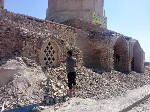 در تصاویر ارسال شده، تخریب دیوار ضلع جنوبی آرامگاه یعقوب لیث در حالی تخریب شده که بنر کارفرمایی اداره کل میراث فرهنگی استان خوزستان بالای سر همان دیوار تخریب شده، نصب است!