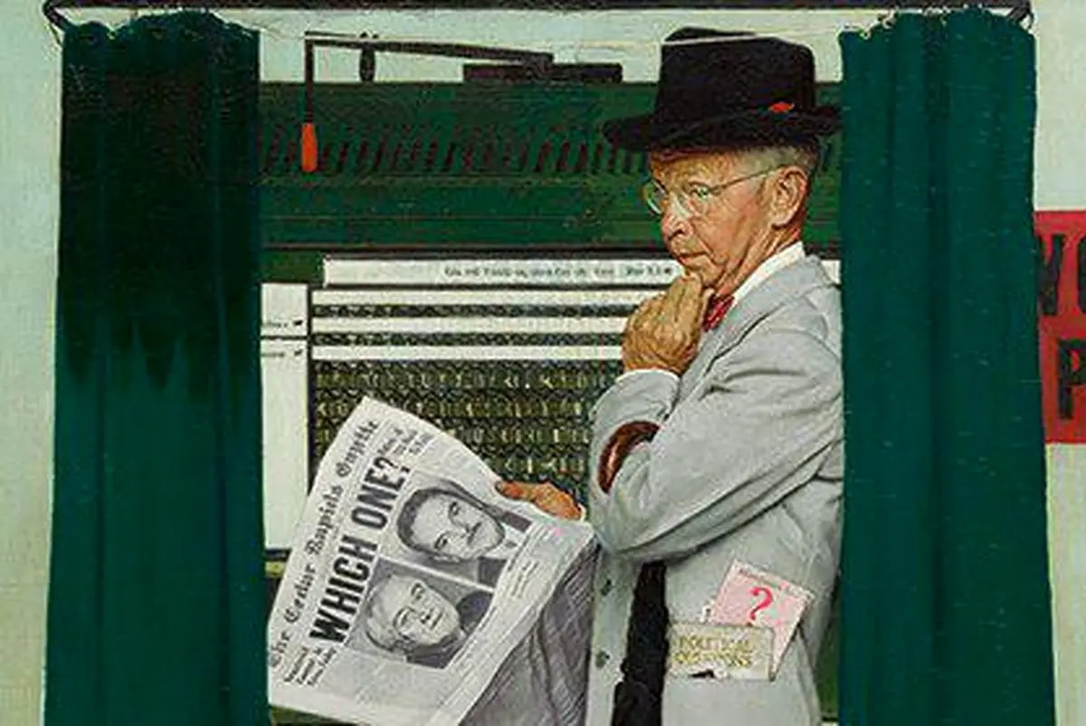 این تابلو «کدامیک؟ (مردد؛ مردی پای صندوق رای)» نام دارد. در انتخابات سال ۱۹۴۴ فرانکلین دلانو روزولت نامزد حزب دموکرات و توماس ای.دوی نامزد حزب جمهوریخواه بود.