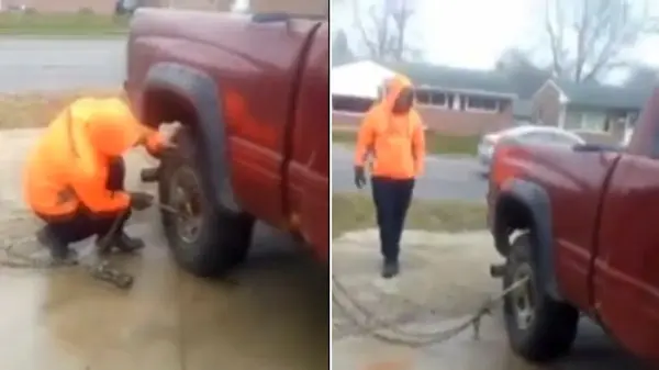 چند جوان آمریکایی که برای باز کردن چرخ یک خودرو با مشکل مواجه شده بودند، روش خلاقانهای به کار بردند. آنها با زنجیر، چرخ را به پشت یک خودروی دو دیفرانسیل متصل کردند و با حرکت این خودرو، تایر را بیرون کشیدند.برای ورود به کانال تلگرام ما کلیک کنید.