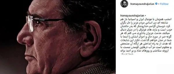 در ادامه متن و تصویر ارسالی همایون شجریان را در رابطه با شایعه فوت پدرش مشاهده می‌کنید: