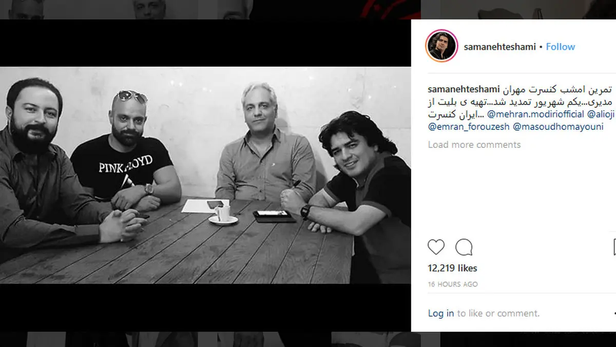 رکنا: سامان احتشامی با انتشار این عکس در صفحه اش نوشت: تمرین امشب کنسرت مهران مدیرى…یکم شهریور تمدید شد.