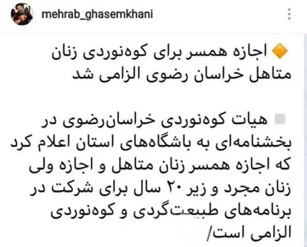 رکنا: محراب قاسمخانی؛ نویسنده سریال های تلویزیونی، به بخشنامه الزام اجازه شوهر برای کوهنوردی زنان در خراسان رضوی اعتراض کرد.