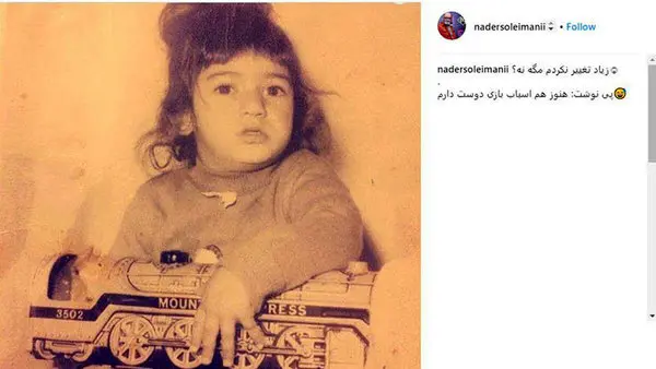 نادر سلیمانی، تصویری جالب از دوران کودکیاش را در اینستاگرام Instagram به اشتراک گذاشت و در توضیح آن، ضمن اشاره به تغییر نکردن چهرهاش از آن زمان تا به امروز، نوشت: «زیاد تغییر نکردم مگه نه؟هنوز هم اسباب بازی دوست دارم.»
