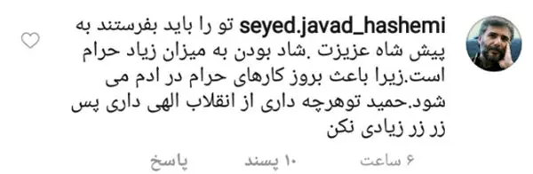 در واکنش به این پست کاربران بسیاری به این بازیگر انتقاد کرده و برخی نیز از او حمایت کردند، اما در این میان کامنت سید جواد هاشمی به شکل غیر قابل باوری توهین آمیز است.