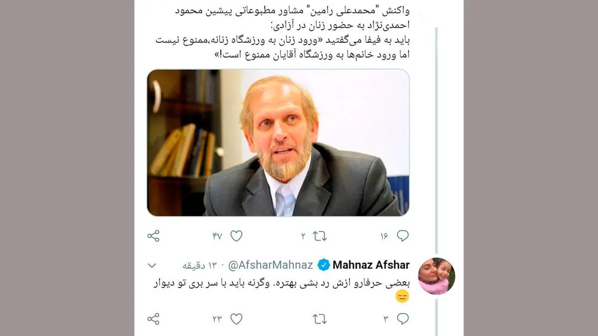محمدعلی رامین، معاون مطبوعاتی دولت محموداحمدی‌نژاد و از چهره‌های ارشد اصول‌گرایان، گفته است که مقام‌های کشورمان باید به فیفا می‌گفتند ورود زنان به ورزشگاه‌های زنان ممنوع نیست؛ ورود زنان به ورزشگاه‌های مردان ممنوع است.برای ورود به کانال تلگرام ما کلیک کنید.