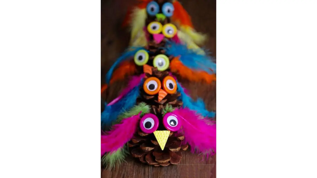 تعدادی پر،چشم های پلاستیکی و منقارهای مثلثی شکل (را با برش روی ظروف پلاستیکی قدیمی) تهیه کنید.با استفاده از چسب(مطابق شکل)چشم ها ،منقار رنگی و پرها را مطابق سلیقه تان روی میوه های کاج بچسبانید.جوجه تیغی های زیبایی که درست کرده اید را می توانید در هر نقطه ای از خانه تان قرار دهید.