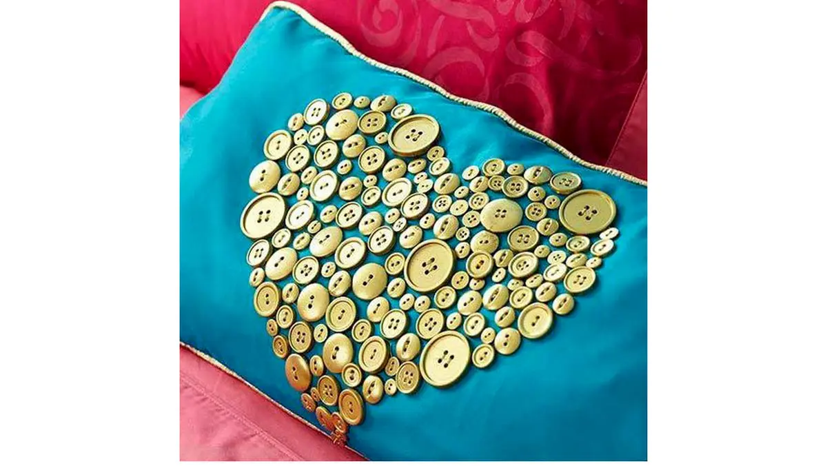 مجموعه ای از دکمه های ساده در اندازه ها و طرح های مختلف تهیه کنید و انها رابا اسپری طلایی رنگ کنید. یک طرح قلب روی کوسن بکشید «با مداد و خیلی کمرنگ» و با سلیقه و دقت دکمه ها را داخل این قلب بدوزید تا شکل زیبایی از قلب طلایی روی کوسن ایجاد شود.بجای قلب هر طرح دیگری دوست داشته باشید میتوانید ایجاد کنید. رنگ و طرح به سلیقه و علاقه شما بستگی دارد.