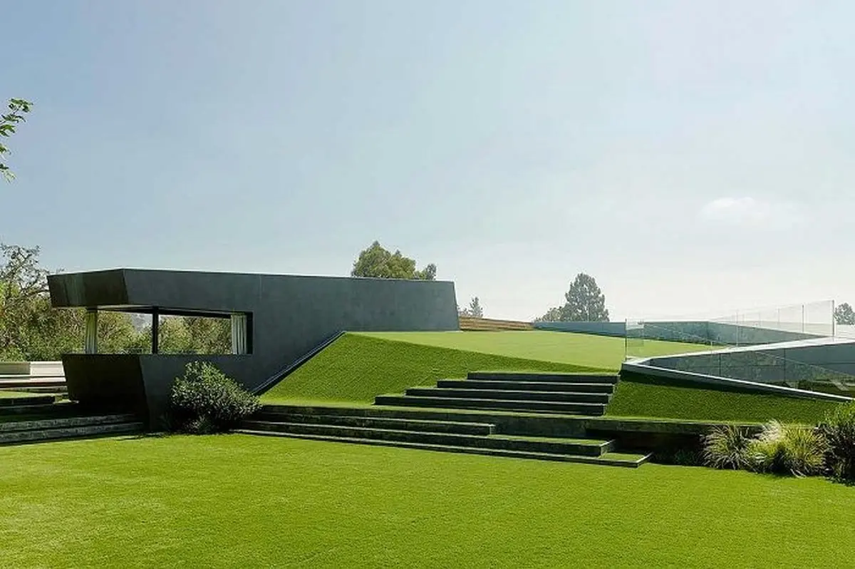 سقف ویلایی در کالیفرنیا به وسیله پوشش سبز و چمن به زمین متصل شده است.