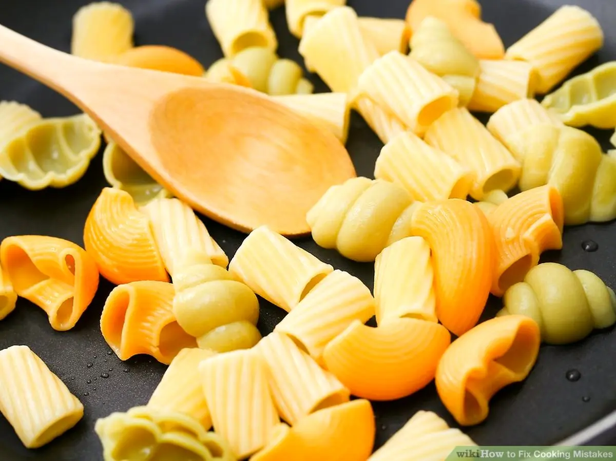 پاستا و یا ماکارونی بیش از پخته و نرم شده را با روغن زیتون، تفت دهید تا کمی سفت شود و خود را بگیرد. سپس برای طعم بهتر، به آن پنیر پارمسان بیفزایید.