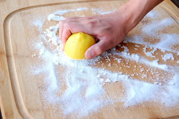 *روی تخته گوشت مقداری نمک بپاشید و نیمی از یکی از مرکبات را روی تخته بمالید. تخته گوشت را با آب داغ و صابون بشویید.