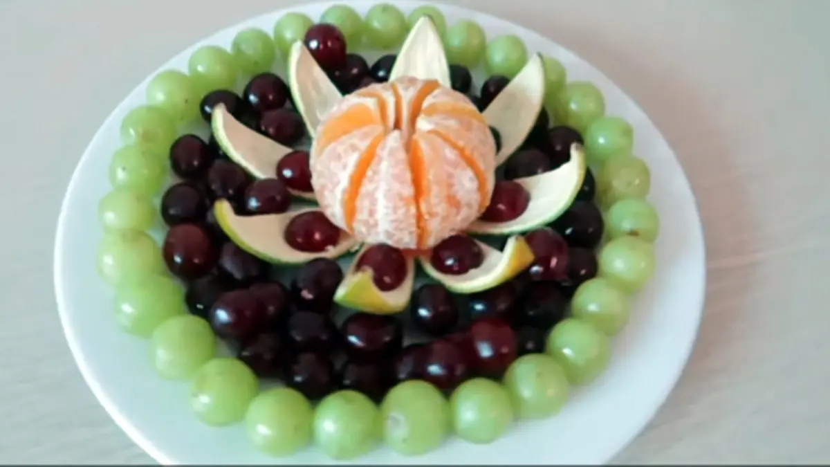 در ویدئوی زیر برای تزیین بشقاب دسر از دو میوه انگور و پرتقال استفاده شده است. شما با انجام چند برش ساده و کمی حوصله میتوانید این کار را در منزل انجام دهید.