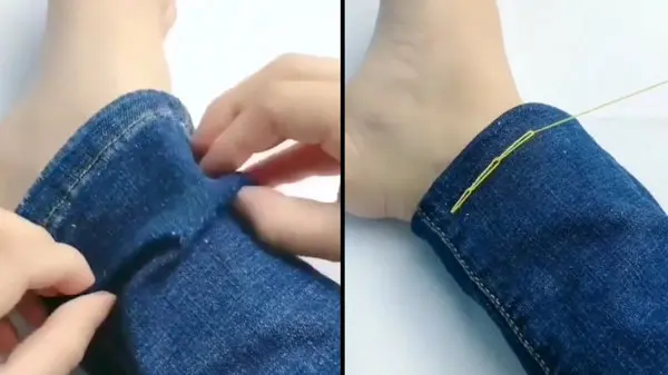 برای این کار کافی است مقدار مد نظر از پارچه شلوارتان را تا کنید و بعد با استفاده از نخ و سوزن حالت دوخت زنجیری به پایین شلوارتان بدهید و بعد با تاکردن آن به سمت بیرون مشاهده می کنید بدون اینکه دوخت شما دیده شود به همان شکلی که می خواستید شلوارتان کوتاه شده است.