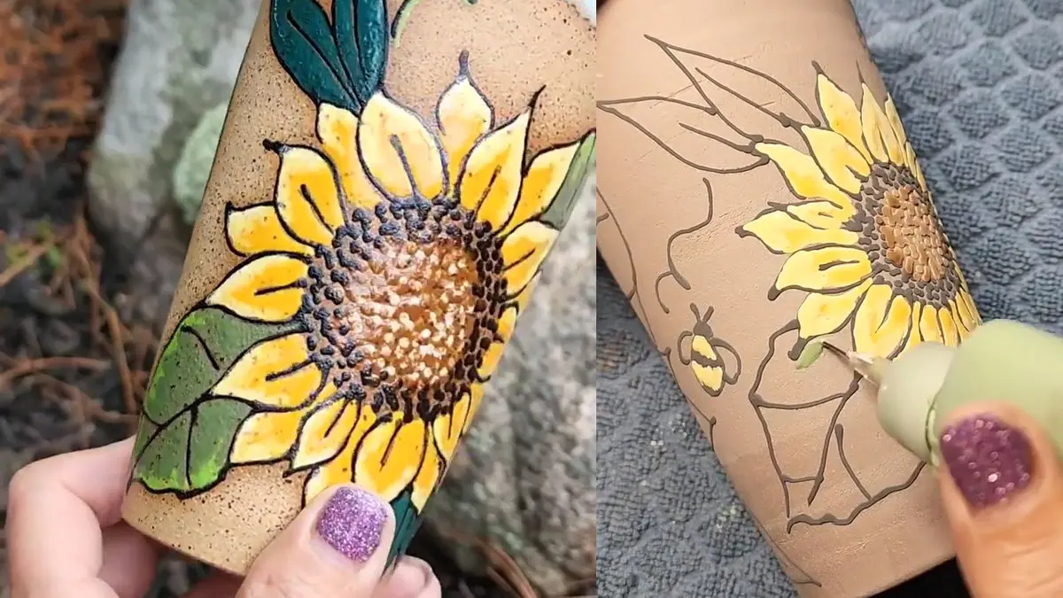 به گزارش رکنا، نقاشی زیبایی را می بینید که روی گلدان سفالی کشیده شده است. با دستگاهی که حالت نقطه کوبی دارد روی گلدان می توانید گل آفتابگردان را ترسیم کنید و با همان وسیله در رنگ های مختلف آن را رنگ کنید.